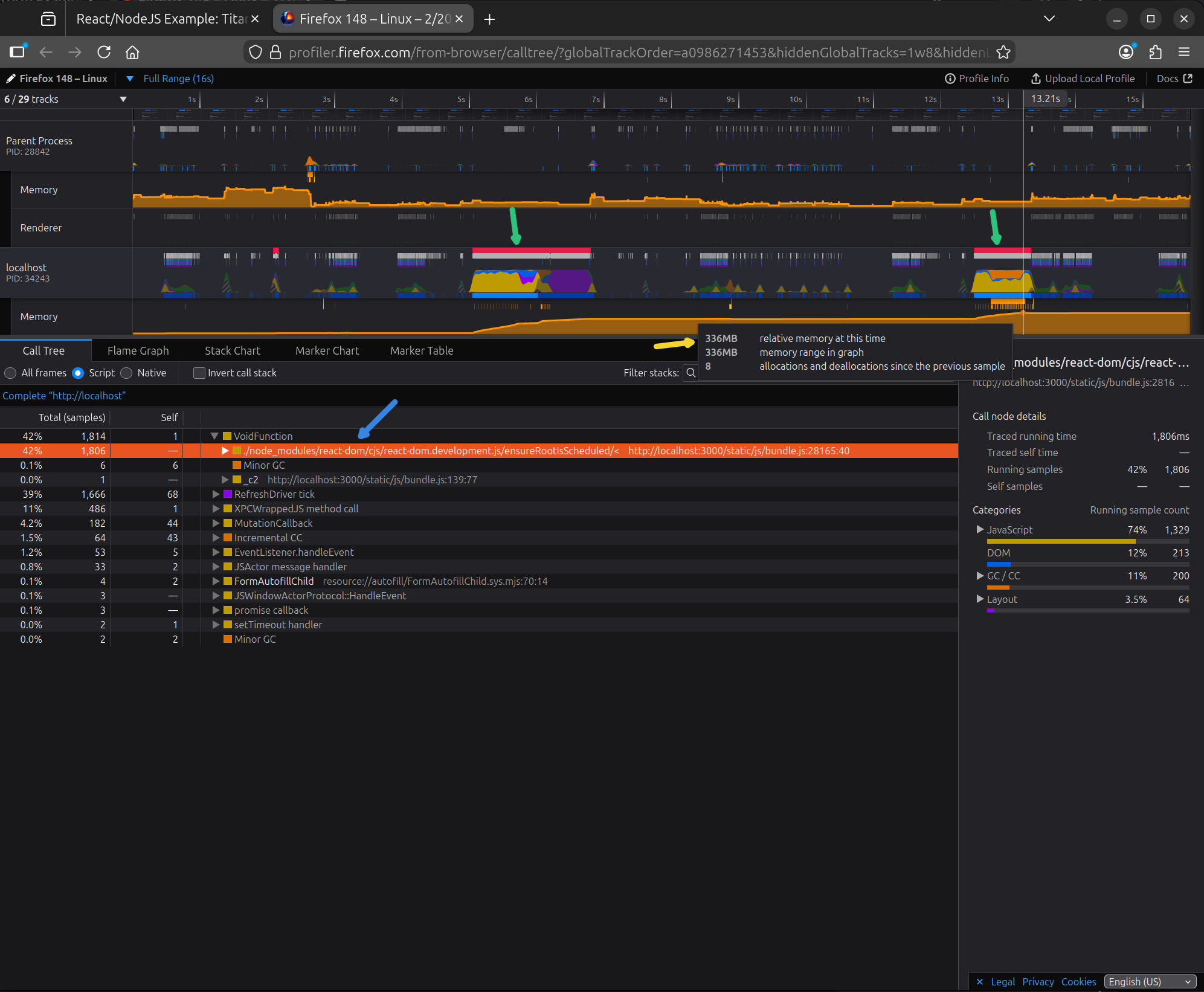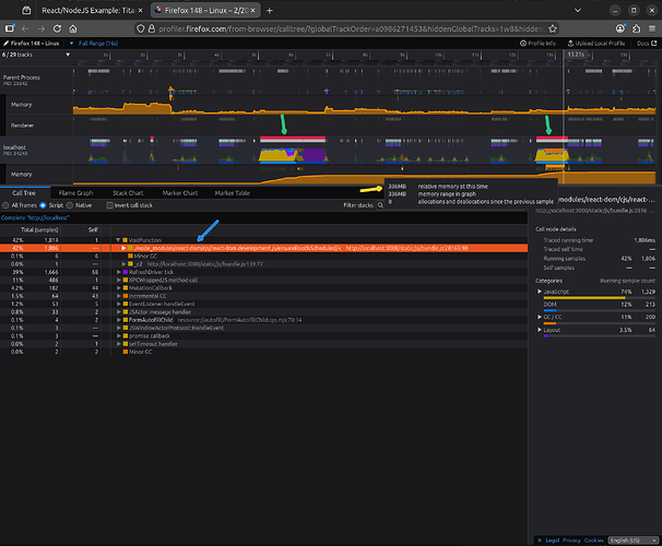 Here we notice several things. The first thing that catches the eye in this screenshot is the presence of two red lines at the top, which we have indicated with green arrows. The red line on the timeline indicates the period during which event processing is delayed due to the browser being busy executing user code. In other words, this is the period when the site is frozen and does not respond to user input, which you do not find in the Alusus result. The second noteworthy thing is what we indicated with a blue arrow: that the majority of the processor time was spent executing user code, i.e., JavaScript code within the React library, whereas in the Alusus case, the majority was spent in the browser engine. The third thing to note, indicated with a yellow arrow, is the ‘relative memory at this time’ value, which here is 336 MB, compared to the 7.17 MB in the Alusus case!