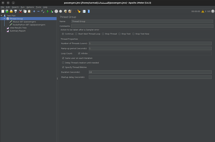 In a single thread in JMeter, a request is sent and the result is waited for before sending the next request. Thus, we guarantee that the number of requests on the server at any time will not exceed one, meaning requests are not run in parallel. This ensures we compare the efficiency of the language itself without the influence of the number of threads. The result of this test was as follows: