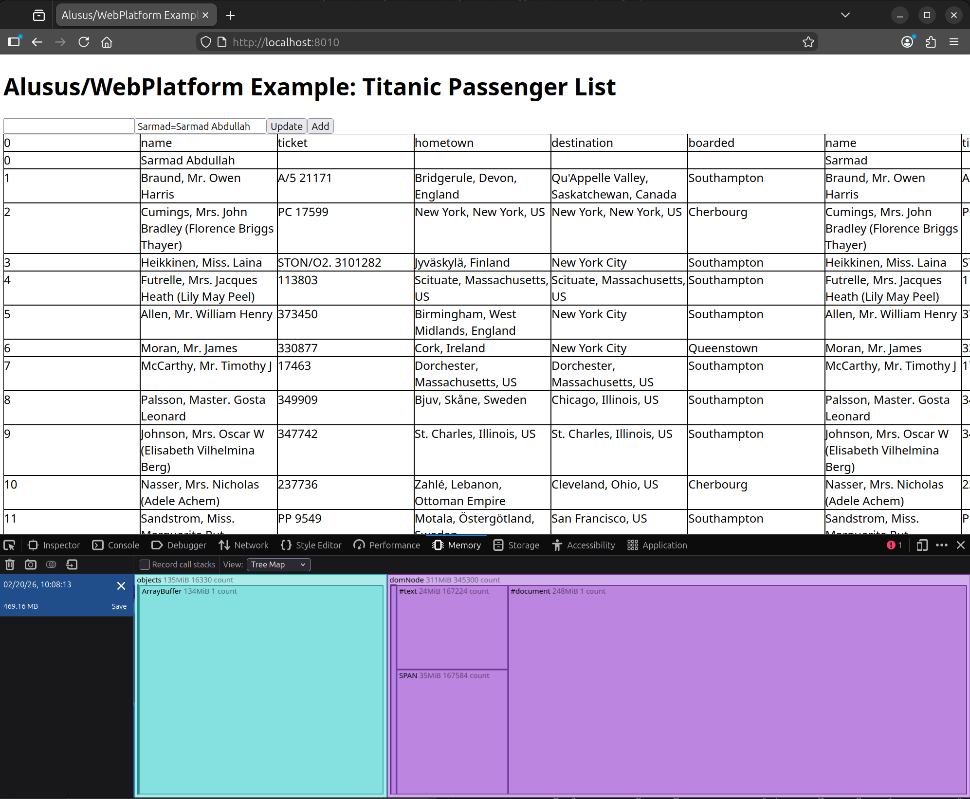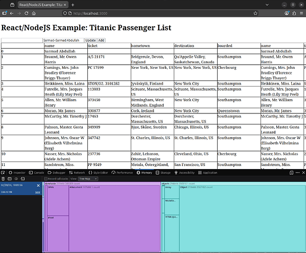 The user interface performance comparison will depend on two things: memory consumption and the responsiveness of the user interface in non-trivial cases. Our interface is very simple because it’s just a table, but we want to simulate a more complex interface, and we also want to amplify the load on the interface to magnify the performance difference to a level easily noticeable using the performance monitoring tools provided by Firefox. Therefore, we will increase the data size by a factor of 8 by repeating it on the server side 8 times, i.e., returning 8 duplicate copies of the data instead of one. After loading the page, we will perform two operations in the user interface and measure the interface’s load and responsiveness during these these two operations. The first operation is adding a new record to the table, and the second operation is toggling a field value in the table.