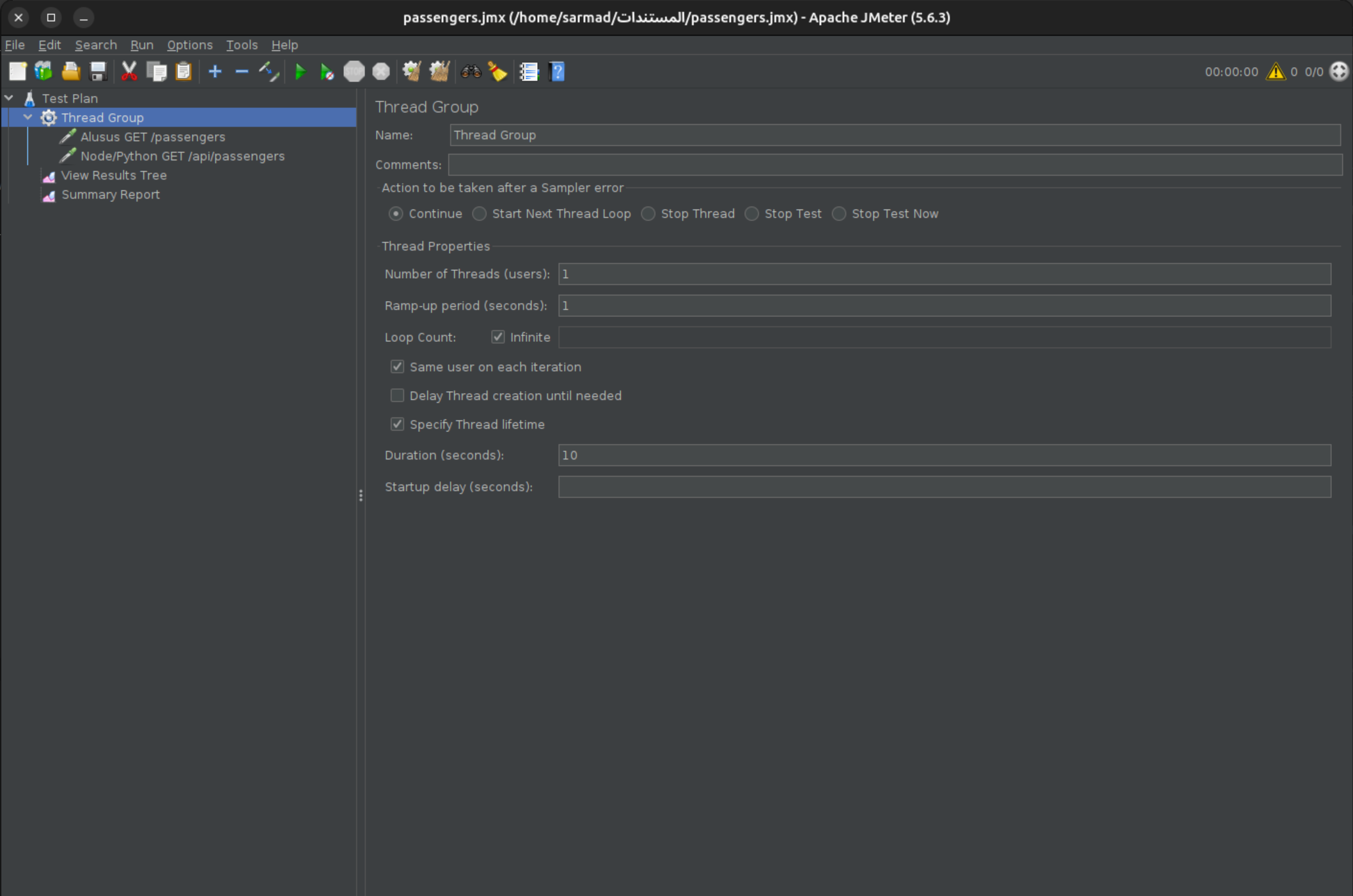 In the second test, we increased the number of threads in JMeter to 8 instead of one, while keeping the execution time at 10 seconds. In this case, the server was subjected to 8 parallel requests, and the result was as follows: