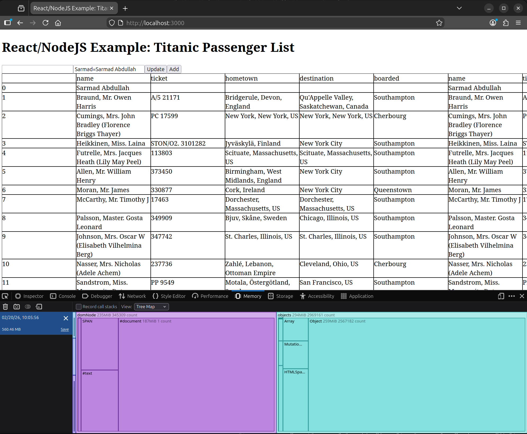 - On our site, we entered a name in the second input field at the top of the page, so the field value became ‘Sarmad’, then we clicked the Add button.