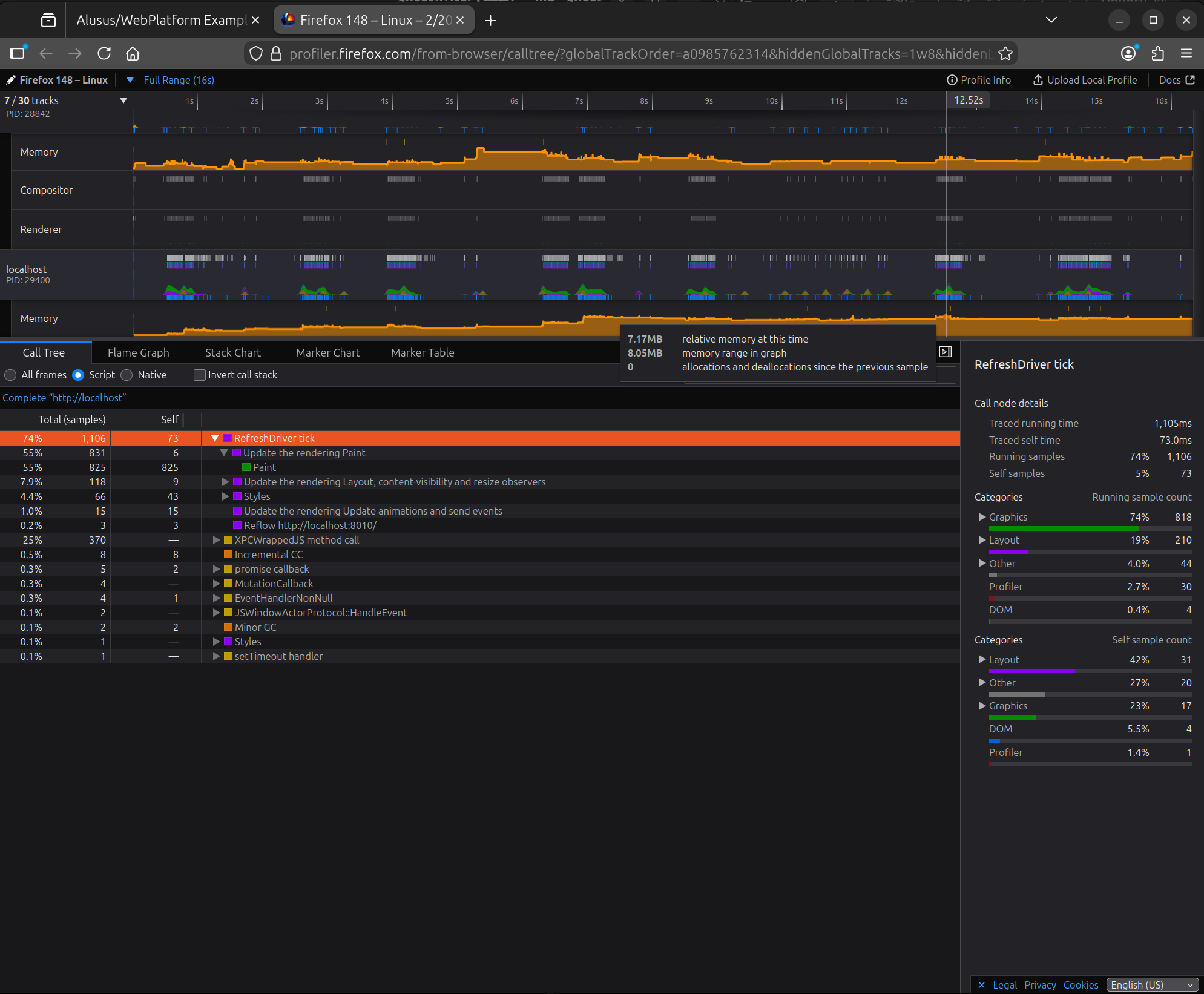 In the Alusus result, we note that most of the time (74%) was spent in the ‘Refresh Driver tick’ task, which are the operations that occur inside the Firefox engine to update the interface. We also note that the ‘relative memory at this time’ metric, which is the amount of memory increase compared to the start of recording, was 7.17 MB.