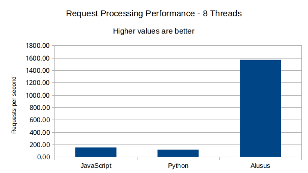 We note from this result that Alusus was about twice as fast as JavaScript, and approximately three times faster than Python. Since requests are sent sequentially and not in parallel, this result indicates that the completion time for a single request in Alusus was half that of JavaScript, and one-third that of Python. That is, Alusus’s performance excelled not only in the number of users the server can handle, but also in response time.